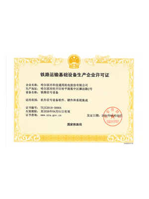 獲得國家鐵路局頒發(fā)“鐵路運(yùn)輸基礎(chǔ)設(shè)備(機(jī)車信號)生產(chǎn)企業(yè)”行 政許可證書